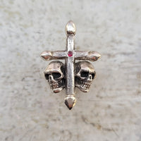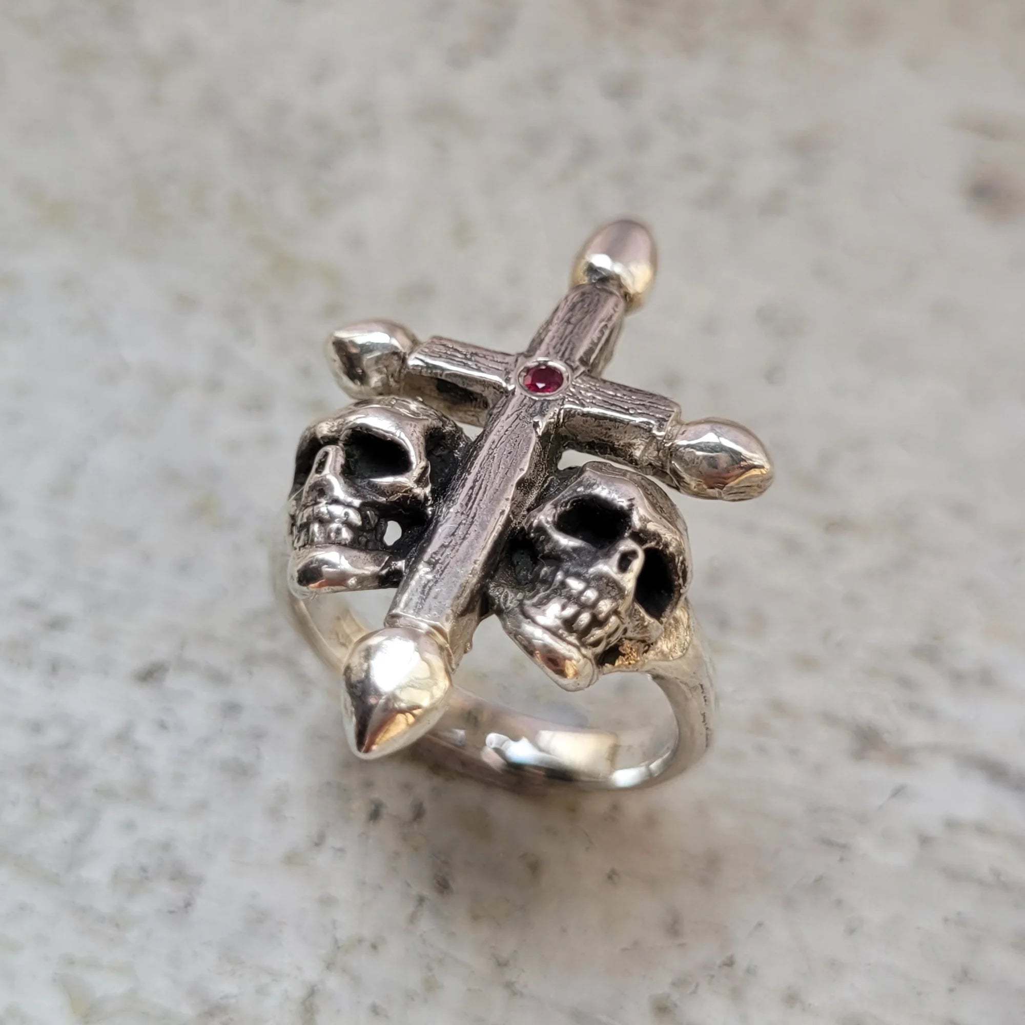 ANT HAT sterling silver cross and skull ring. The skull is cast from a mould of an original hand carved piece and the cross individually handcarved. Finished by hand to a matte finish with recesses oxidized.Hand made in Melbourne.