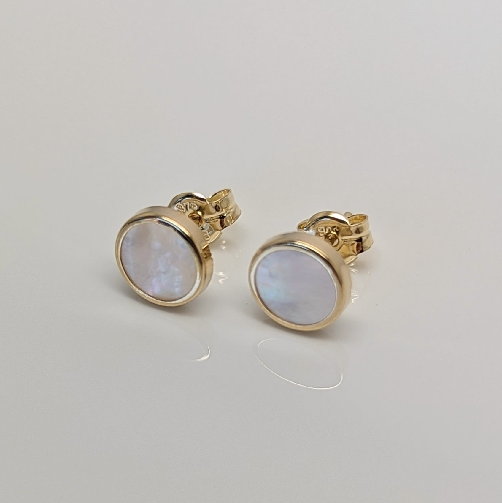 Plain 9ct yellow gold flat studs of mother of pearl.