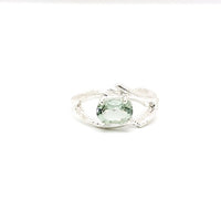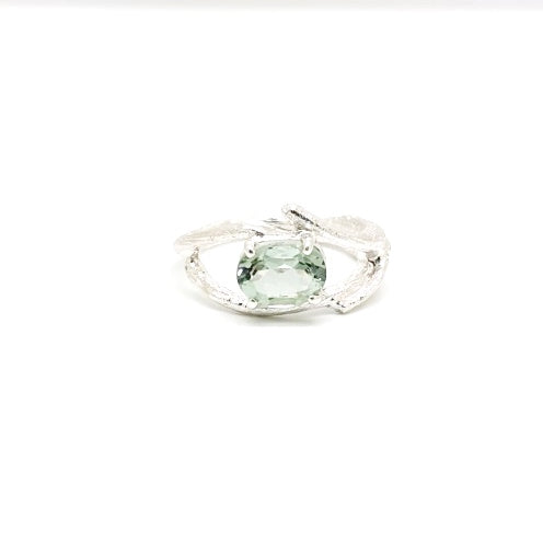 Kirra-Lea Sterling silver Angel Hair vine ring featuring one four claw set oval mint quartz. Delightfully textured metal created from what nature bestows.