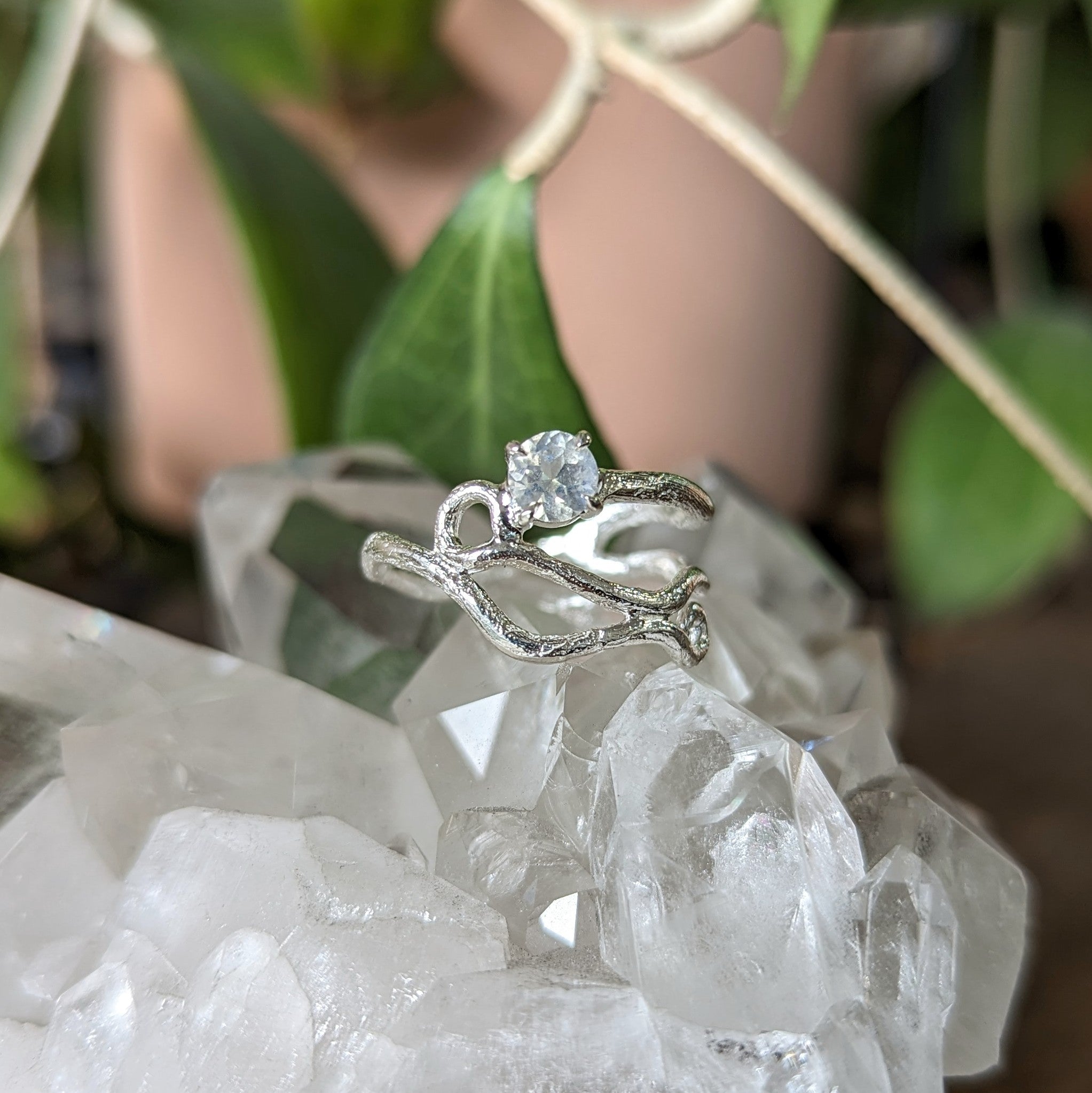 Kirra-Lea Sterling silver grape vine ring with claw set round moonstone. Delightfully textured metal created from what nature bestows.