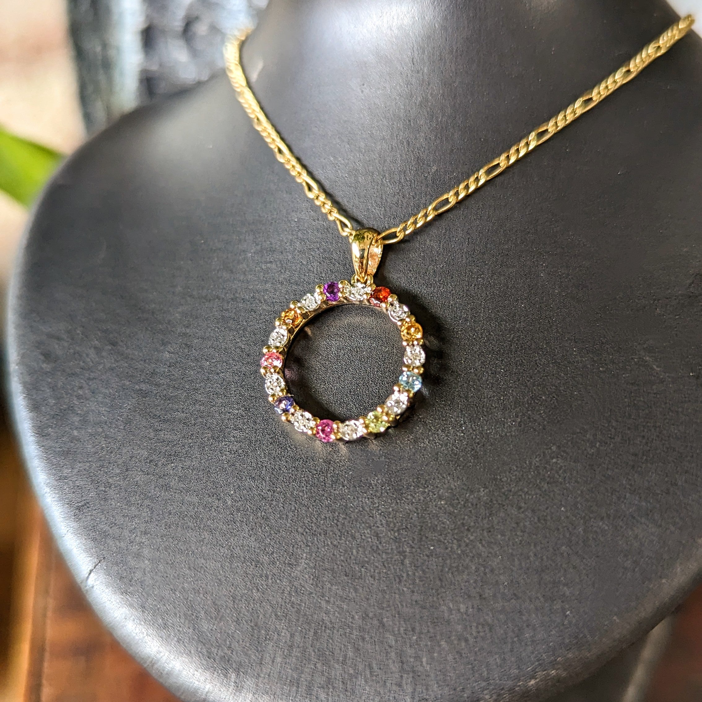 9ct yellow gold circle pendant, with diamonds and semi-precious gemstones set.
