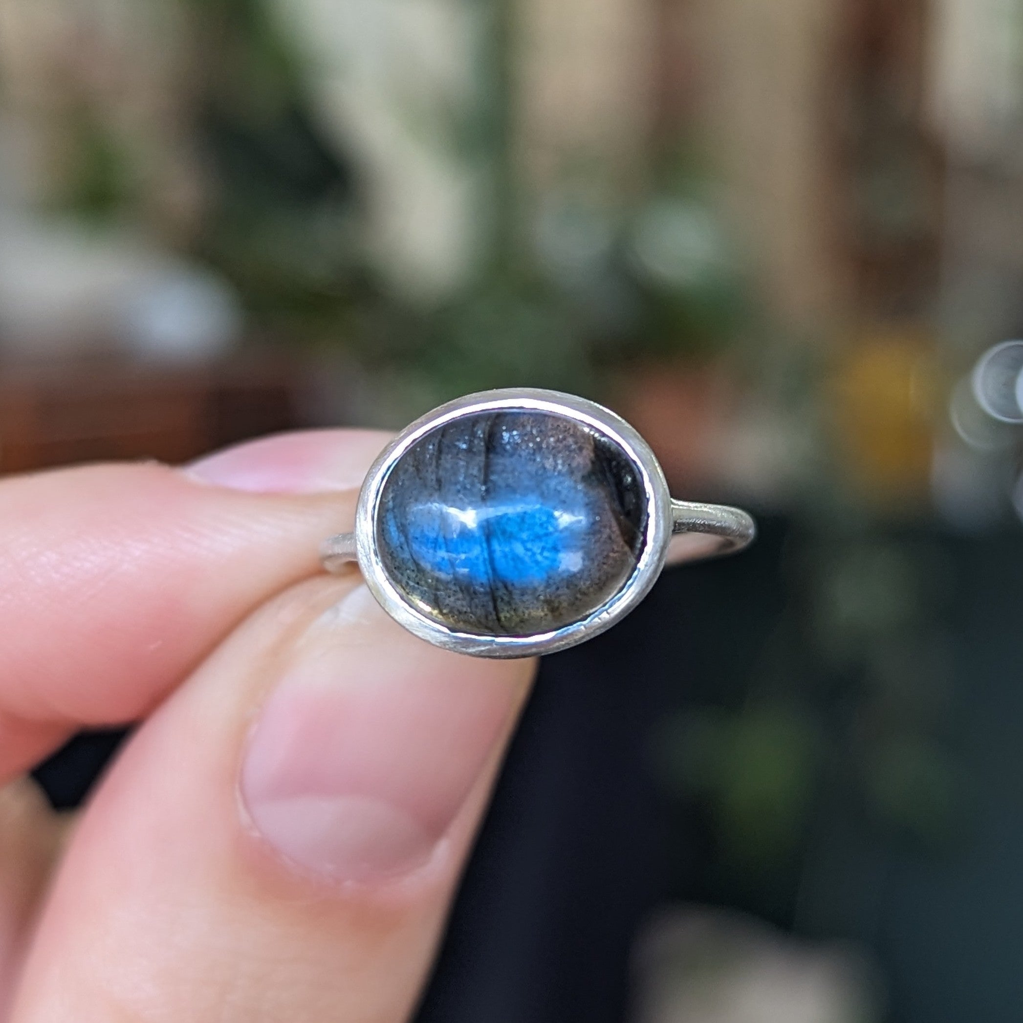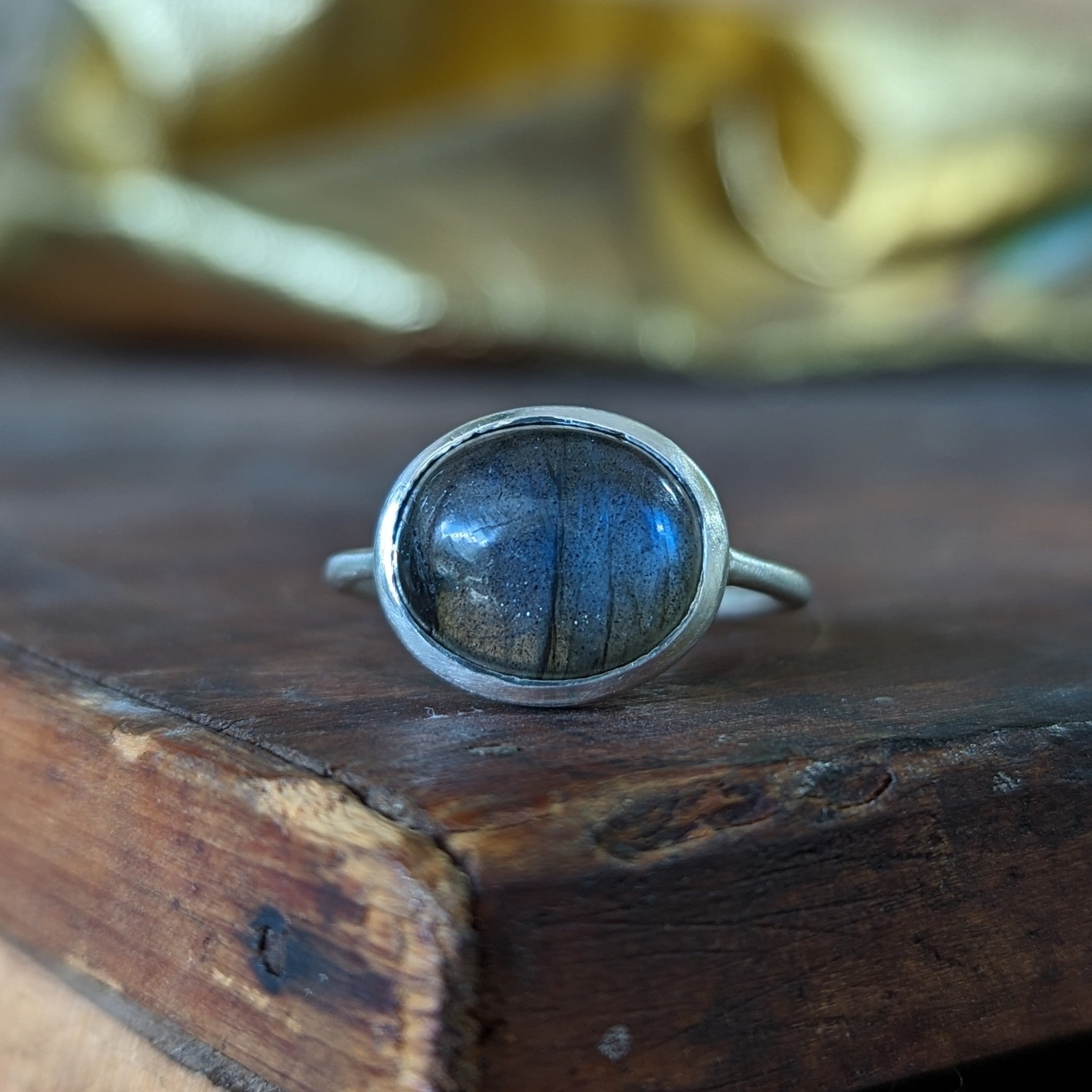 An oval labradorite is complemented perfectly with a bezel setting and sterling silver matte finish in this vintage-inspired yet simple and modern ring.